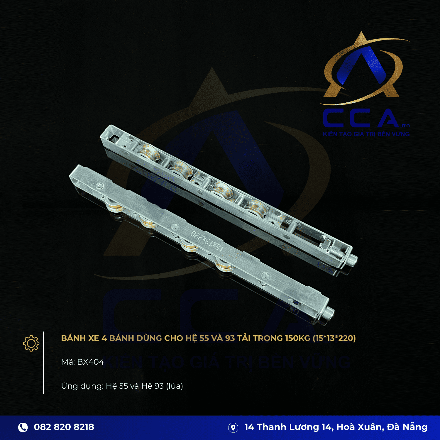 Giải pháp chịu tải đa hệ hoàn hảo cho các công trình sử dụng cửa lùa nhôm kính! Bánh Xe 4 Bánh BX404 nổi bật với khả năng tương thích kép cho cả Hệ 55 và Hệ 93 (và các hệ nhôm tương đương). Với cấu tạo 4 bánh xe và khung chịu lực mạnh mẽ, sản phẩm dễ dàng gánh vác các cánh cửa siêu nặng với tải trọng lên đến 150 Kg mỗi bộ. Kích thước 15x13x220 mm được tối ưu hóa để lắp đặt linh hoạt, đảm bảo cánh cửa lùa của bạn trượt êm ái, ổn định và không bị xệ trong thời gian dài.