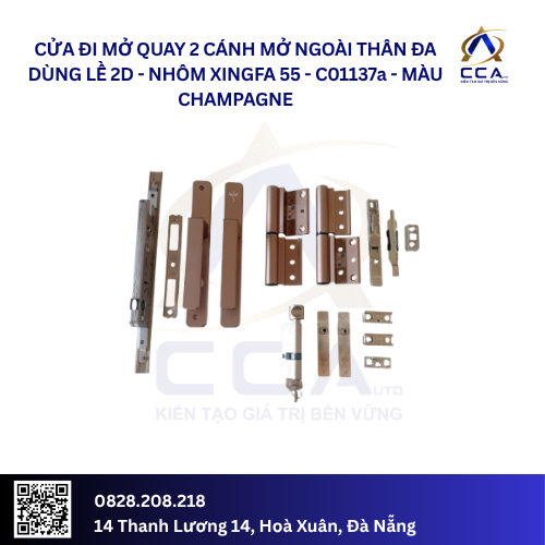 Bộ phụ kiện cửa đi mở quay 2 cánh mở ngoài nhôm Xingfa hệ 55 thân đa điểm được thiết kế đồng bộ, sử dụng bản lề 2D trục 22 dài 17cm cao cấp giúp cửa vận hành nhẹ nhàng, ổn định và bền bỉ theo thời gian. Tất cả chi tiết phụ kiện được sản xuất chính xác, hoàn thiện tinh tế, mang lại vẻ thẩm mỹ cao và độ kín khít tuyệt đối cho hệ cửa.