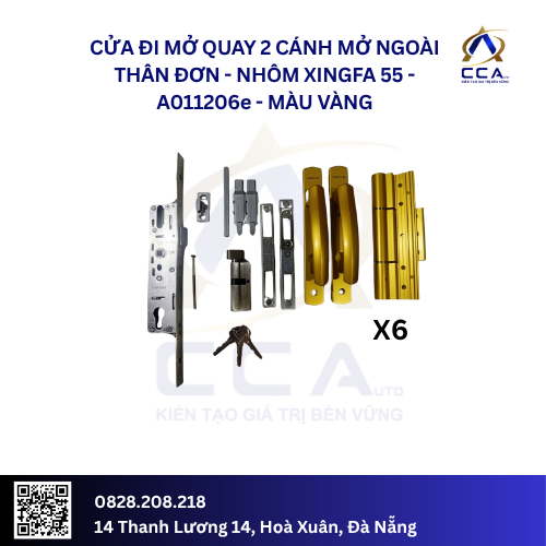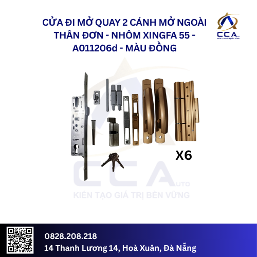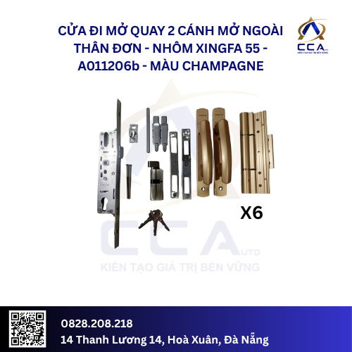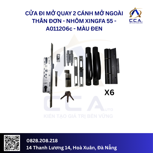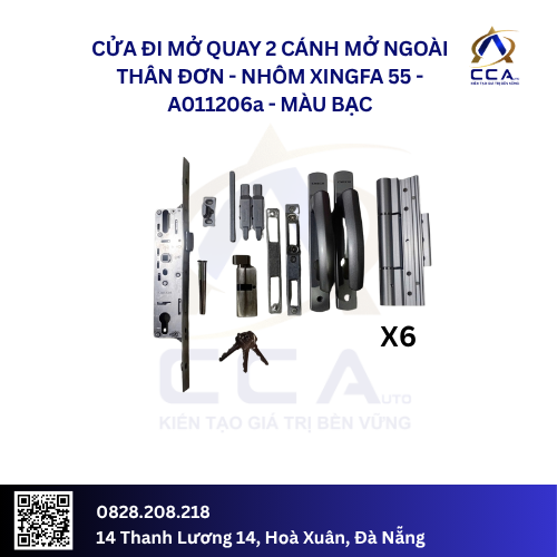 Bộ phụ kiện được thiết kế dành riêng cho cửa đi mở quay 2 cánh mở ngoài thân đơn hệ Xingfa 55, bao gồm cánh chính và cánh phụ. Cấu hình sử dụng khóa đơn điểm kết hợp chốt cánh phụ — đảm bảo độ kín khít, an toàn và bền bỉ. Tất cả linh kiện được sản xuất bằng nhôm anode cao cấp màu bạc , chống ăn mòn, đồng bộ hoàn hảo với nhôm Xingfa.