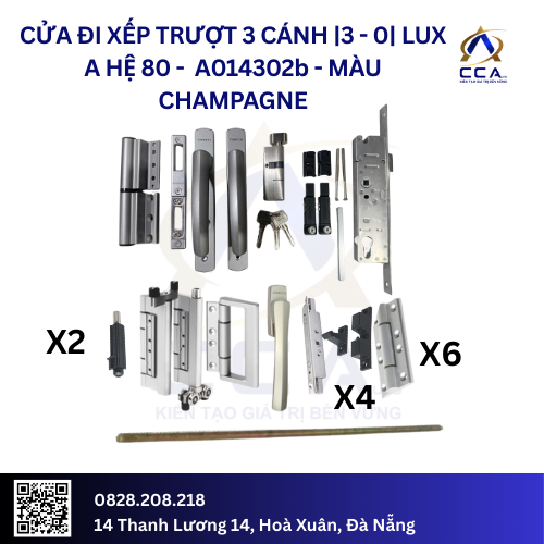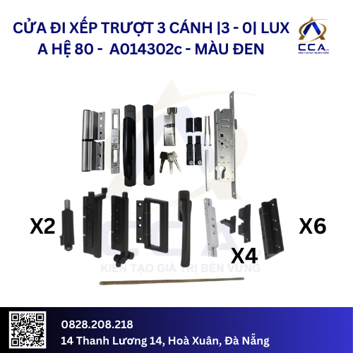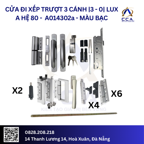 Bộ phụ kiện này được thiết kế chuyên biệt cho hệ cửa đi xếp trượt 3 cánh (3-0) sử dụng nhôm LUX A HỆ 80. Đây là một giải pháp đồng bộ và cao cấp, đảm bảo sự vận hành êm ái, an toàn và chịu lực tốt cho cánh cửa.