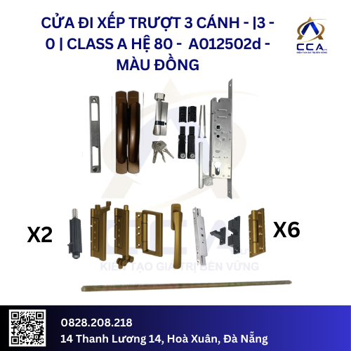 Bộ phụ kiện Cửa Đi Xếp Trượt 3 Cánh Class A hệ 80 (Mã A012502) được cấu hình đầy đủ cho cả chức năng mở quay – xếp trượt, đảm bảo hệ cửa vận hành êm ái, khóa chắc chắn và bền bỉ. Hệ thống bao gồm đầy đủ phụ kiện cho khả năng chịu lực, điều chỉnh kín khít và tăng cường an toàn bảo mật.