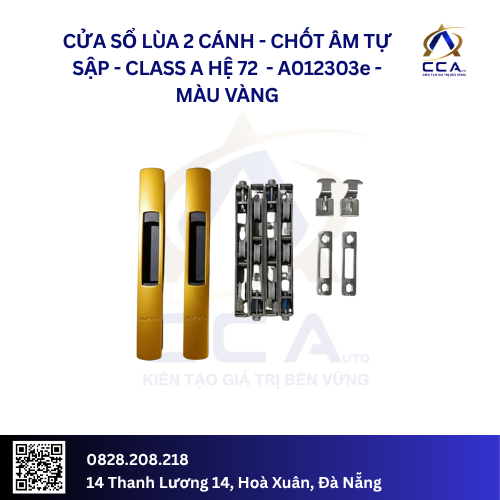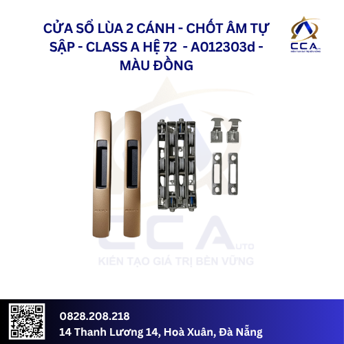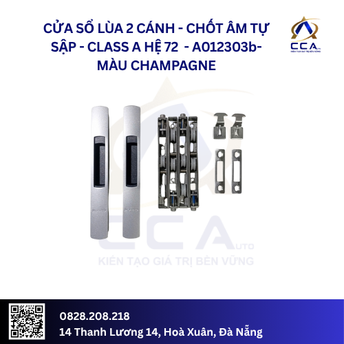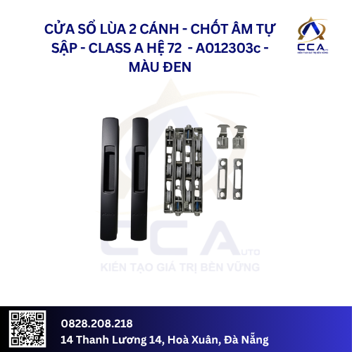 Bộ phụ kiện chuyên biệt cho cửa sổ lùa 2 cánh hệ 72 Class A, nổi bật với cơ chế chốt âm tự sập hiện đại. Dòng phụ kiện này mang lại sự tiện lợi tối đa: tự động khóa khi cửa đóng lại, loại bỏ thao tác khóa thủ công.