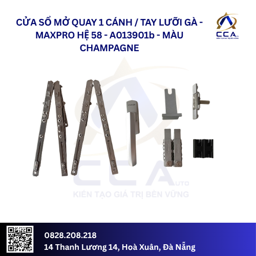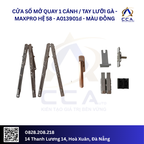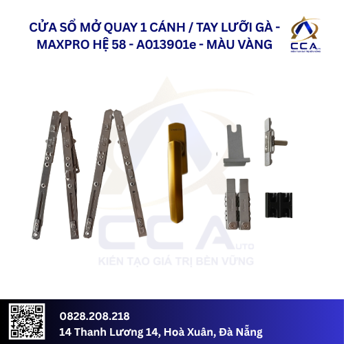 Giới thiệu Bộ phụ kiện cửa sổ mở quay 1 cánh chất lượng cao, được tối ưu hóa cho hệ nhôm MAXPRO 58. Combo A013901 bao gồm tay nắm, đầu chia chuyển động, bản lề ma sát và khóa biên, mang lại sự chắc chắn, vận hành êm ái và độ bền bỉ vượt trội. Đây là giải pháp lắp đặt dễ dàng, hoàn hảo cho các công trình yêu cầu tính thẩm mỹ và độ kín khít cao.